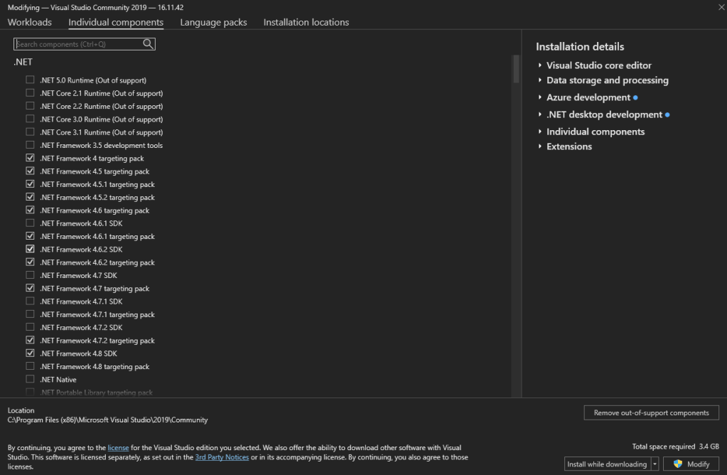• .NET Framework 4.7.2 development tools (widely used and stable, and recommended for new development.)